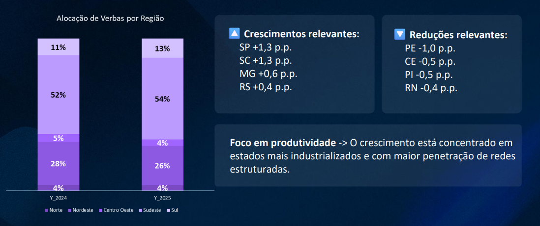 No entanto, os dados mais recentes mostram uma mudança importante na lógica de alocação. Diferente do ciclo anterior, o crescimento deixou de estar concentrado em regiões específicas e passou a seguir critérios de produtividade, execução e potencial de conversão no ponto de venda.